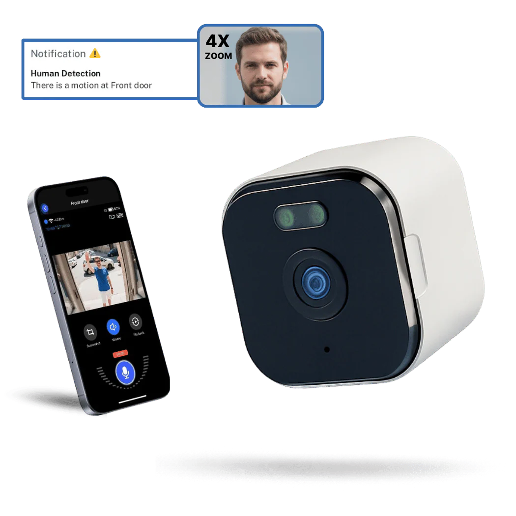 Wide-angle lens with 4× zoom captures faces, plates, and packages. No blind spots. (Can also connect up to 4 cameras)